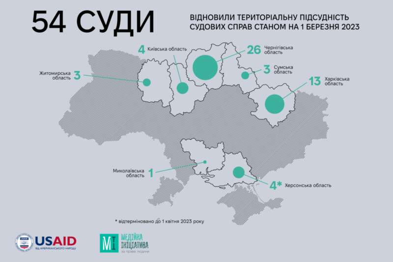 Возобновили работу 54 суда: Житомирская область – 3 суда; Киевская область – 4 суда; Николаевская область – 1 суд; Харьковская область – 13 судов; Херсонская область – 4 суда (отсрочено до 1 апреля 2023); Черниговская область – 26 судов; Сумская область – 3 суда.