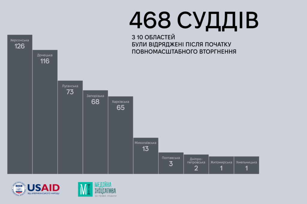 В Высшем совете правосудия по запросу МИПЧ сообщили, что в связи с невозможностью осуществлять правосудие во время военного положения, 171 суд изменил территориальную подсудность судебных дел. Из них 117 судов на первое марта этого года не смогли вернуться назад: