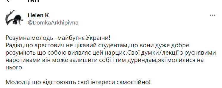 арестович презирает украинцев, украинский язык и очень часто несет полную дечь, почему он должен выступать перед студентами вузов? Зачем студентам гадить в миски? слушать арестовича вредно для здоровья pic.twitter.com/JeQvOX9Daf