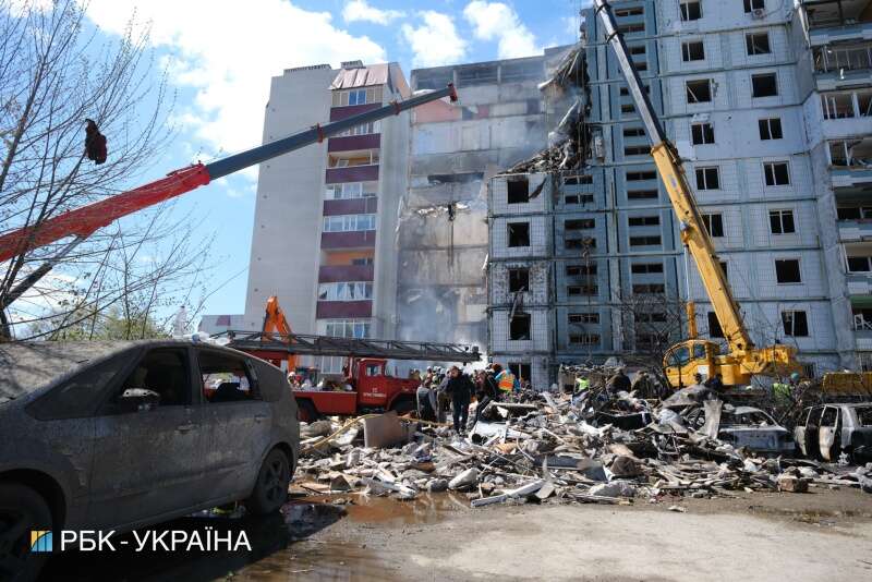 Корреспондент РБК-Украина сообщает, что спасатели все еще разбирают завалы поврежденного дома. Российская ракета разрушила практически весь подъезд. Остатки завалов продолжают гореть. Кроме того, взрывом выбило окна в соседних домах.