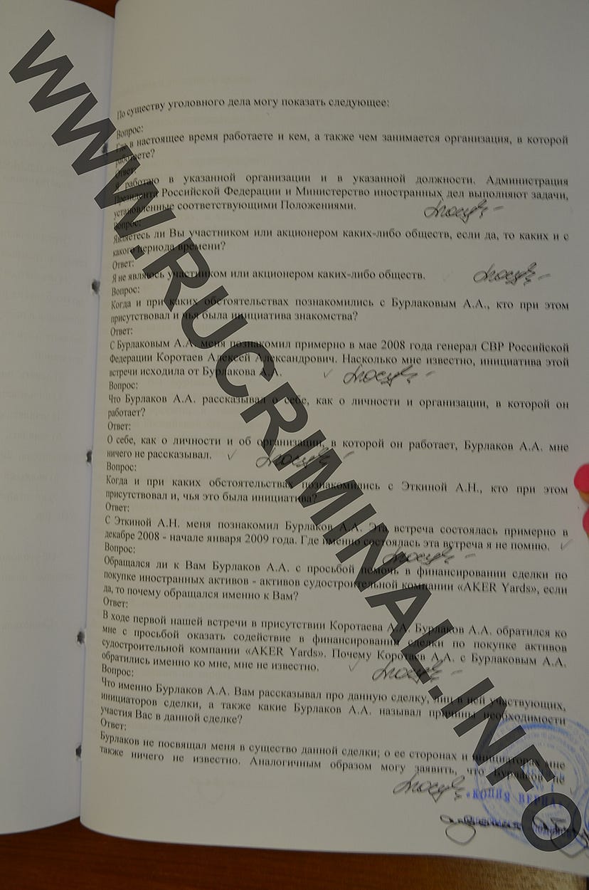 Среди других заказных убийств банды на слушаниях рассматривали эпизод с расстрелом российского бизнесмена Андрея Бурлакова , причиной чего стал конфликт вокруг контроля над европейскими судостроительными верфями Wadan Yards , реальным владельцем которых мог быть именно Юсуфов. В ходе расследования убийства своего подельника Андрея Бурлакова, министр Юсуфов сообщил, что с Бурлаковым его познакомил в мае 2008 именно Алексей Коротаев, которого он знал как генерала СВР.