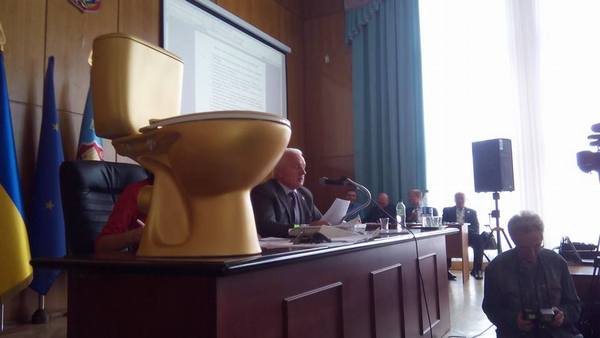 Депутаты Бориспольского горсовета подарили своему мэру “золотой” унитаз в знак протеста против решения о выделении бюджетных средств на установку “кресла желаний” в городе за 119 тыс. грн.
