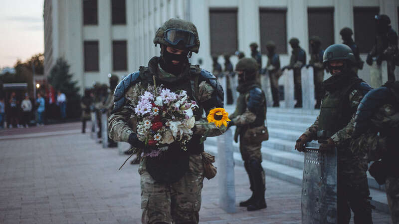 Протест беларусов против итогов выборов 2020 года был подчеркнуто мирным. На кадрах протестов четко видно, что силовики нападали на протестующих – а не протестующие на силовиков. Примеры чего-то подобного силовому противостоянию были единичными: разве что баррикады в первые ночи протестов и случаи самообороны от силовиков (часто без знаков, нередко – «людей в штатском»). Не было такого, чтобы в силовиков массово летели камни, коктейли Молотова или, тем более, пули.