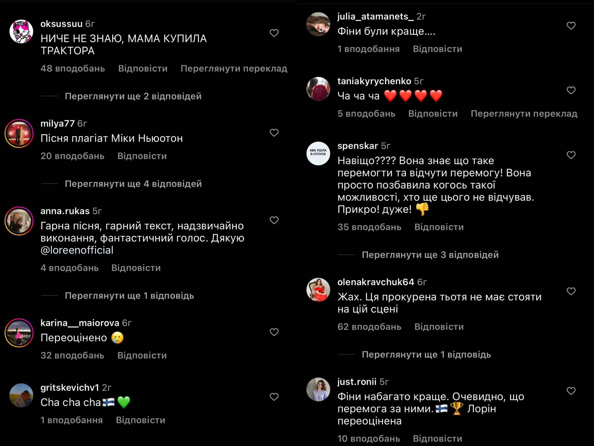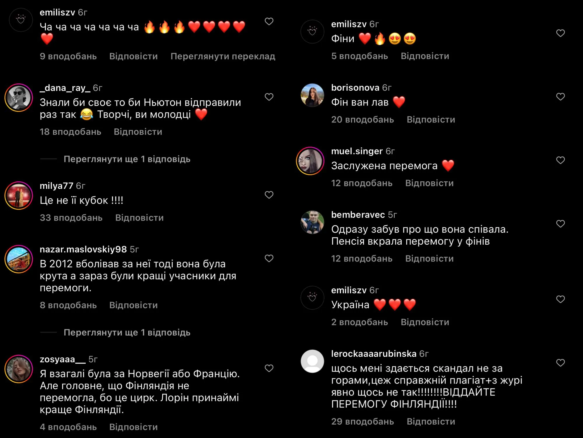 "Фу, финны были лучшими в 100 раз. Куплена победа", "Финляндия должна была победить", "И ради этого я не спала до двух ночи?", "Может, вокально Финляндия была и не лучшей, но то, как все кричали "Ча Ча Ча" и танцевали – это высокий показатель и оценка для исполнителя. Финляндия, вы заслужили эту победу", "Финны намного лучше. Очевидно, что победа за ними. Loreen переоценена", "Это не ее кубок!", " Финн ван лав", – делятся своим мнением украинские еврофаны.