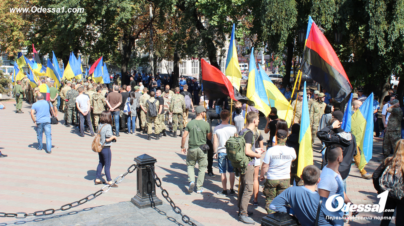 Сегодня, 13 сентября, на Соборной площади собрались представители патриотических организаций Одессы, среди них члены «Свободы», «Самообороны Одессы» и «Правого сектора».