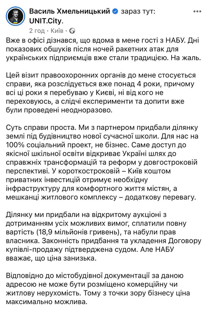 «Мы с партнером приобрели участок земли для строительства новой современной школы. Для нас на 100% социальный проект, не бизнес… Участок мы приобрели на открытом аукционе с соблюдением всех возможных требований, оплатили полную стоимость в размере 18,9 млн грн и приобрели права владельца», – написал Хмельницкий.