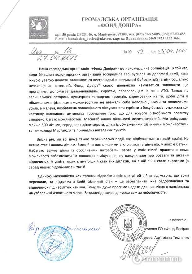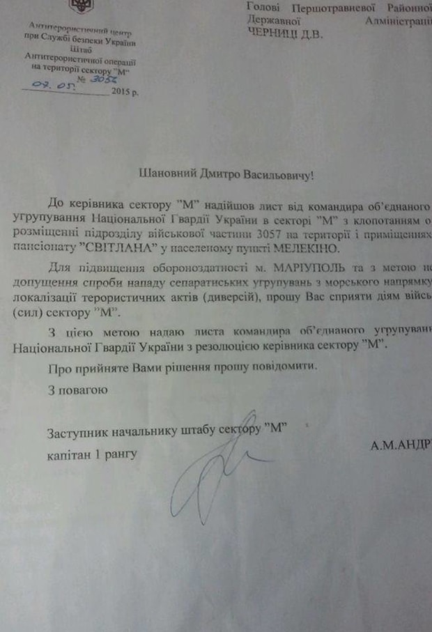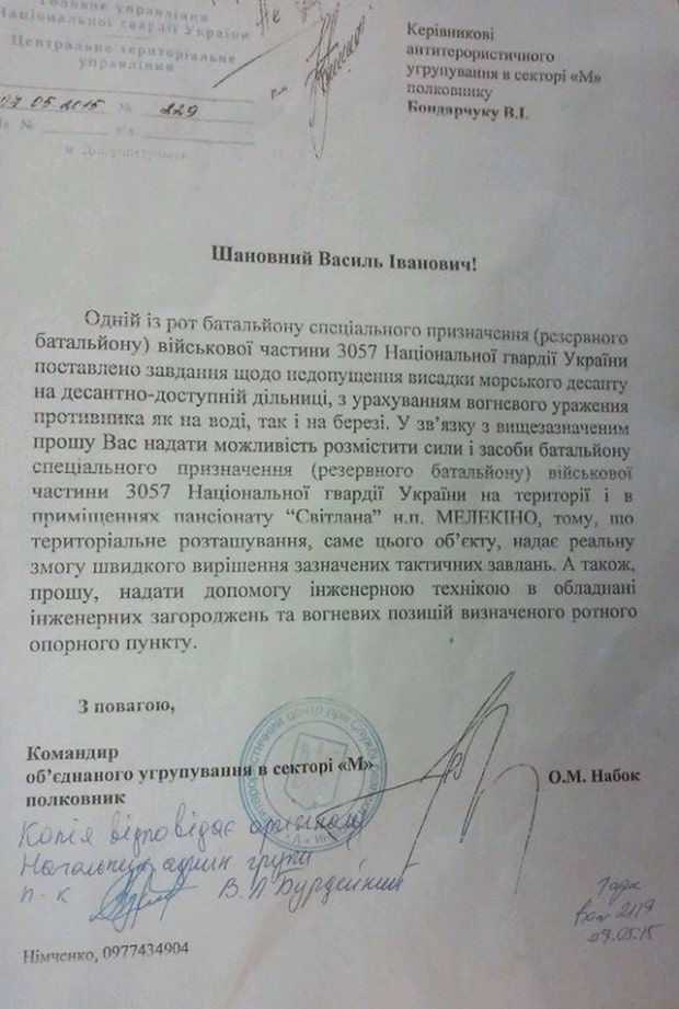 В результате, нашли документ, вооружившись которым бойцы "Донбасса" приехали заселяться в "Светлану". Это подписанное 7 мая командиром объединенной группировки в секторе М полковником Александром Набоком письмо на имя руководителя антитеррористического группирования в секторе М полковника Бондарчука, где первый просит последнего рассмотреть возможность размещения "одной из воинских частей" именно в "Светлане" - для защиты берега от возможной высадки морского десанта.