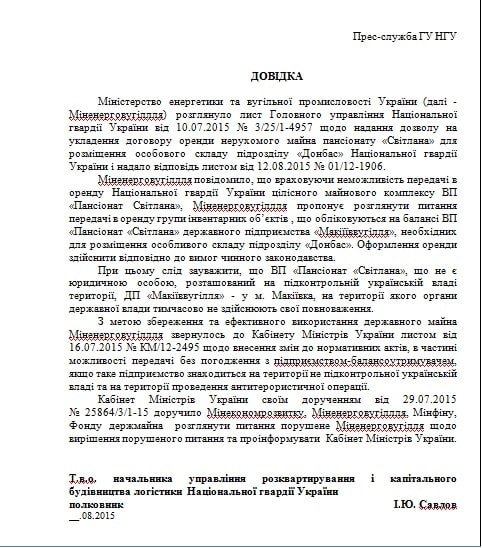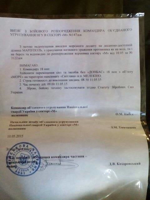 Ни в НГУ, ни в штабе сектора М нам не смогли помочь с документальным подтверждением существования приказа "Донбассу" занять именно пансионат "Светлана". Поэтому мы начали искать эти документы сами – благо, в эпоху интернета в сети можно найти что угодно.