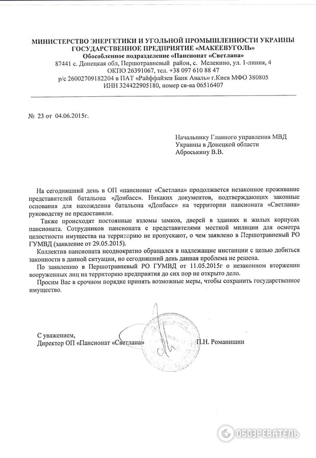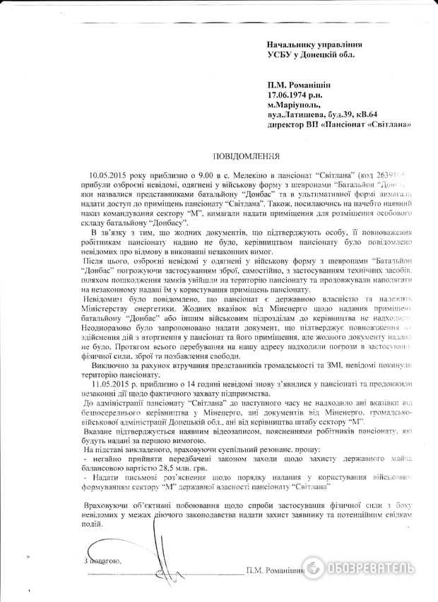 Но самое главное, в батальоне "Донбасс" уверяли: "Светлану" заняли, выполняя... боевые задачи. Ссылаясь при этом то на распоряжение руководства Нацгвардии, то на приказ командования сектора М. "На самом деле, то, что они показывали – это и не распоряжение вовсе. Это обращение одного полковника к другому с просьбой о изыскать возможность расположения батальона "Донбасс" в пансионате "Светлана". Вдумайтесь в формулировку… А вот приказа о том, чтобы батальон занял наш пансионат, просто не было", - возмущается Романишин.