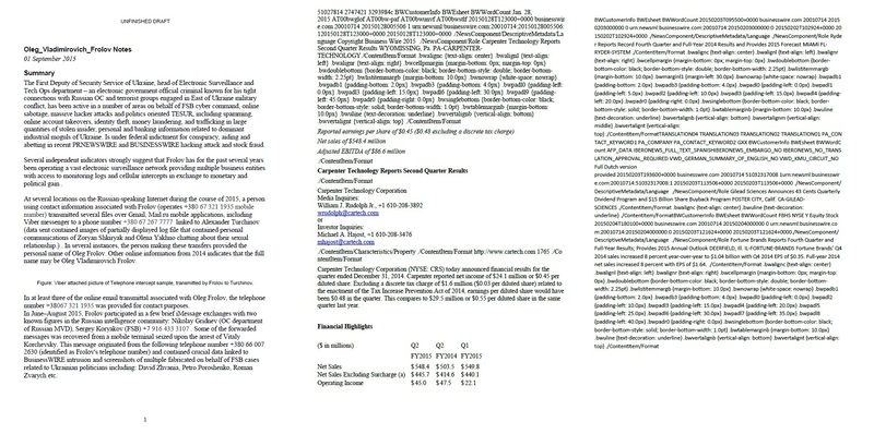«Сегодня мы выпускаем просмотр масштабного экономического и политического шпионажа, который продолжается в это время… Украинские чиновники безопасности наняли хакеров и использовали их ресурсы для шпионской деятельности за людьми и компаниями. Мы говорим об Олеге Фролове из СБУ, который давно нанял нас для взлома информации таких известных людей, как: Петр Порошенко, Олег Ляшко, Олег Тягныбок, ДавидЖвания, Борислав Береза, Юрий Косюк и многих других. Фролов хотел получить подлинную информацию о жизни указанных лиц. Являясь активным офицером ФСБ Фролов создал крупную схему шпионажа, в котором он выступил исходные коды и ключи криптографии свойство UNIS корпорации (на основе ИТ-компании Украины, правительства подрядчика управляемой Зварыча семьи). ЮНИС основе систем контроля мобильных терминалов и Bluetooth крипто механизм (система AMON) в настоящее время используется большинством чиновников Украины. Фролов контролирует все эти звонки и связь. Информация, которая в настоящее время собраны Фролов постоянно передается высокопоставленным чиновникам ФСБ, таким как: Олег Танков, Сергей Игнатченко и Сергей Коряков, в том числе руководителю Чечни Кадырову и мафиозным боссам. Фролов также наблюдает за министром Арсеном Аваковым, офисных чиновников прокуратуры и бизнс-группой "Континиум" Игоря Еремеева. Люди Фролова ежедневно подслушивания украинских журналистов, как: Виталий Портников, Сергей Иванов, Алена Яхно, Вячеслав Бутусов и другие.