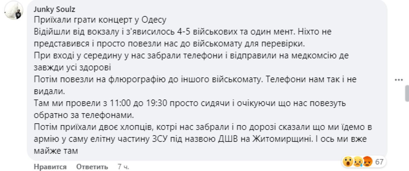 По словам одного из участников группы Junket, их принудительно отправили на медицинскую комиссию, а затем — в расположение десантно-штурмовых войск в Житомирской области.