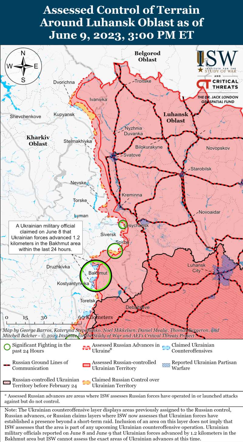 Исследователи добавили, что 9 июня российские и украинские войска провели ограниченные наземные атаки к югу от Кременной (Луганская область). Согласно сообщению Генштаба, ВСУ отразили наземные атаки российских войск в районе Белогоровки (10 км к югу от Кременной) и Веселого (32 км к югу от Кременной). Представитель Южной группы войск России заявил, что российские силы отразили три атаки украинских войск на Лисичанском направлении. Кадры боевых действий с геолокацией свидетельствуют о том, что 24-я отдельная гвардейская бригада войск спецназначения России продолжает действовать в Кременной.
