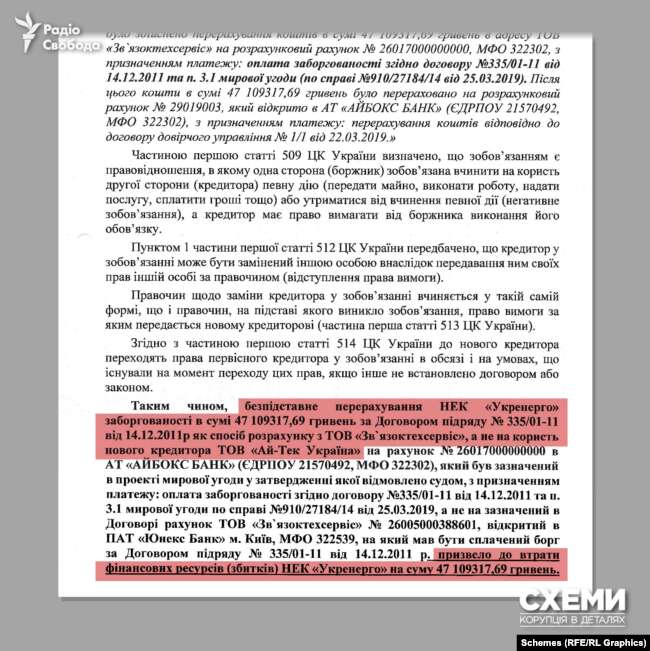 «Безосновательное перечисление «Укрэнерго» задолженности в сумме 47 млн грн как способ расчета с «Связьтехсервис», а не в пользу нового кредитора «Ай-Тек Украина», привело к потере финансовых ресурсов (убытков) «Укрэнерго»», – говорится в документе .