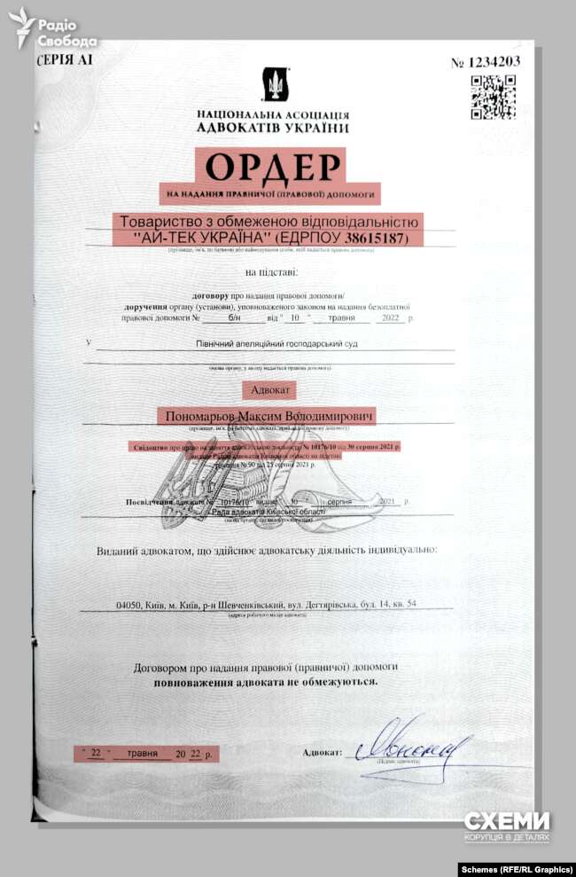«Схемы» приводят выданный по его имени ордер на оказание правовой помощи от этой фирмы.