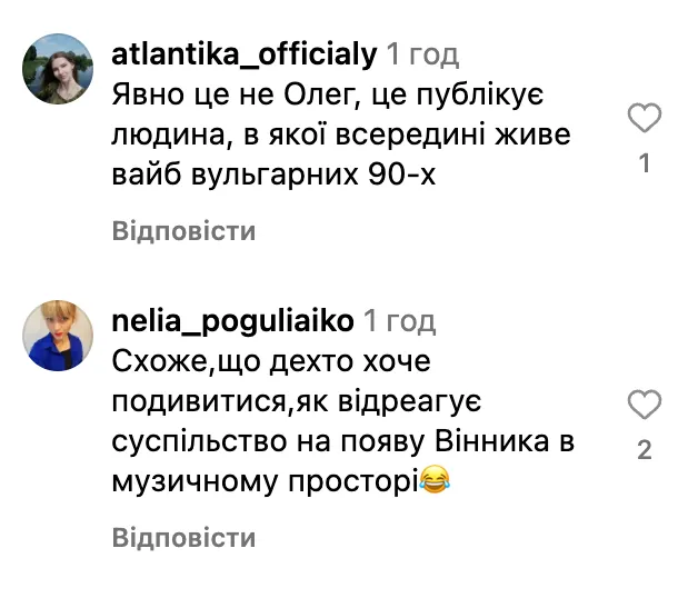 "Ну и зачем публиковать скаченный с ютуба клип? Может, уж вернете страницу артисту, которому она и принадлежит?! Нафига использовать эту страницу для такого..прости господи?!", "Такое впечатление, что страницу решили превратить в свалку", "Очевидно , этот пост не имеет отношения к Олегу Виннику. Надеюсь, артист сможет восстановить доступ к странице", "Александр Горбенко, лучше верни человеку доступ к его странице", - писали украинцы.