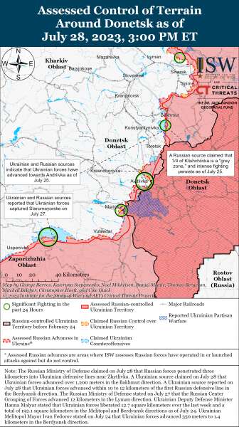 Украинский источник утверждал, что ВСУ 28 июля продвинулись в направлении Бахмута более чем на 1200 метров. Заместитель министра обороны Украины Анна Маляр сообщила, что украинские войска продолжают наступление к югу от города, а Генштаб Украины отметил, что продолжаются бои у Клищиевки, Курдюмовки и Андреевки.
