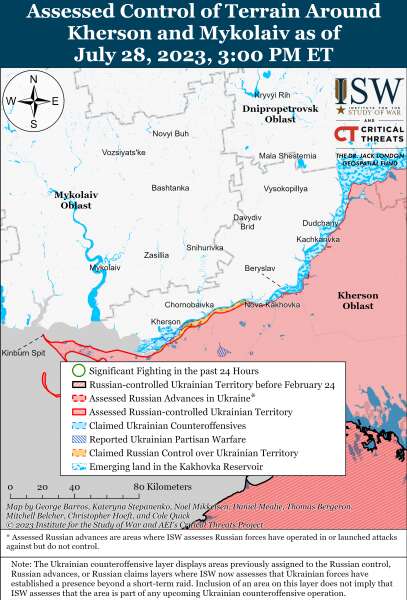 Российские войска вели наступательные действия в районе границы Донецко-Запорожской области и не продвигались 28 июля. В Генштабе Украины сообщили, что российские войска безуспешно пытались отразить утраченные позиции у Ровнополья и Макаровки.