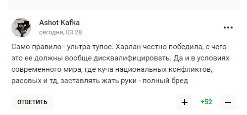 Фанаты стебутся, что как же так, дисквалифировать ту спортсменку, которая победила, а не ту, которая не подала руку.