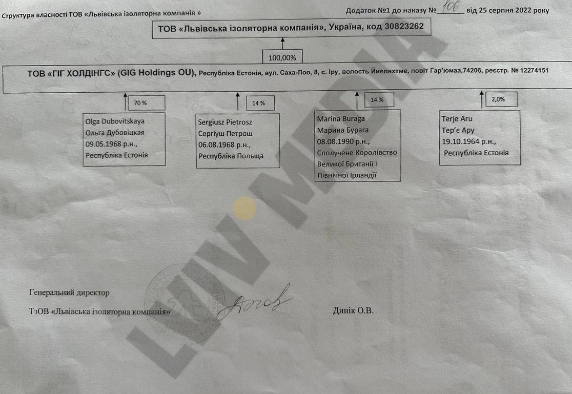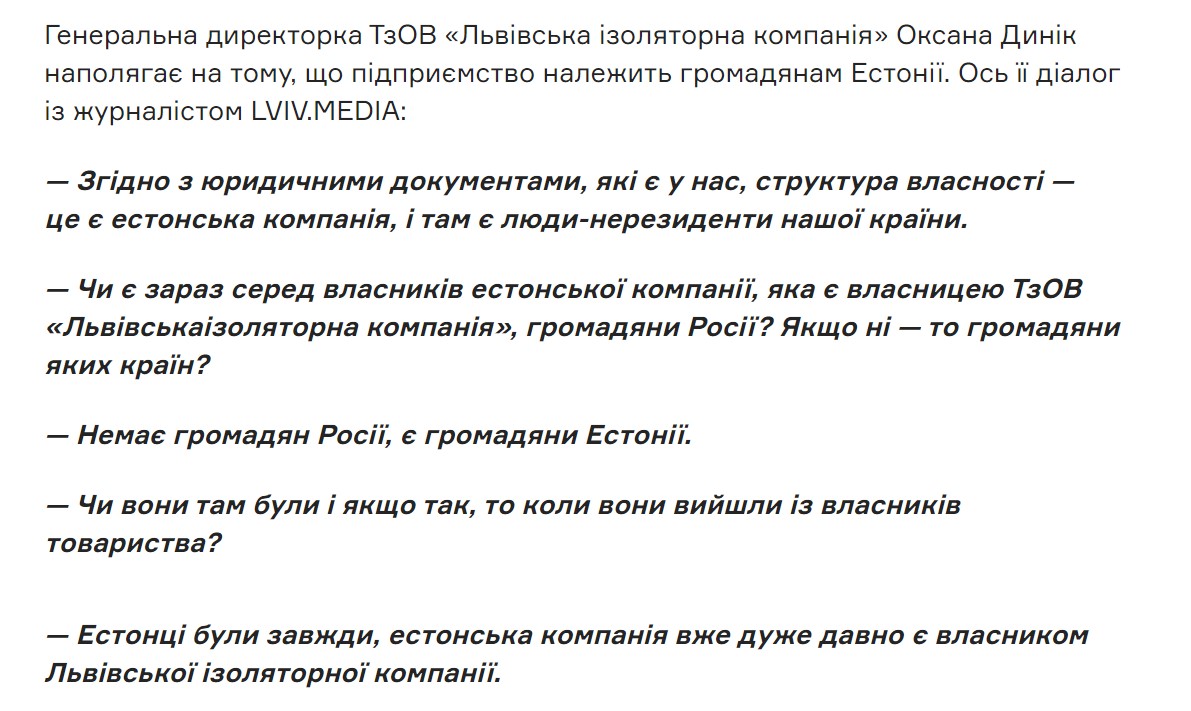 По состоянию на 1 августа 2023 года бенефициарным владельцем ООО «Львовская изоляторная компания» значится гражданка Эстонии Ольга Дубовицкая, а владеет она изоляторной компанией через эстонское ООО «Гиг Холдингс»: