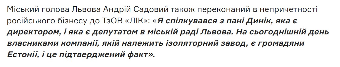 Формально она права, но Дыник утверждает, что россиян среди бенефициаров ООО «Львовский изоляторный завод» не было никогда, что является откровенной неправдой, а с ее стороны выглядит странной забывчивостью.