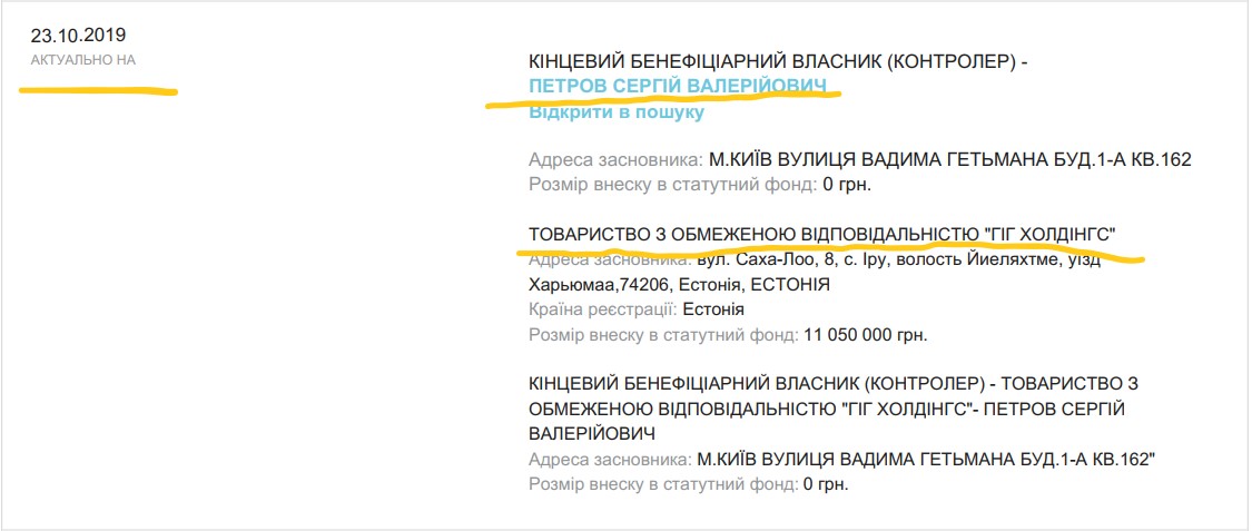А теперь вернемся к ООО «Львовская изоляторная компания». Из данных реестров известно, что по состоянию на октябрь 2019 года его владельцем все так же было эстонское ООО «Гиг Холдингс». Но вот конечным бенефициаром значился Сергей Валериевич Петров: