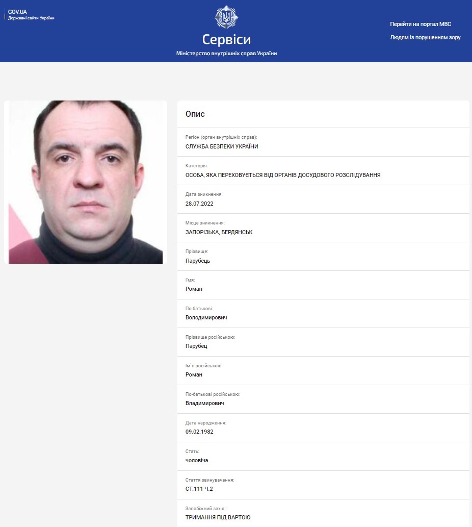 Заметим, что претензии в пророссийской настроенности Парубца выдвигаются не впервые. С лета 2022 года Роман Владимирович находится в розыске : ему инкриминируется государственная измена в период действия военного положения (ч.2 ст.111 УК Украины).