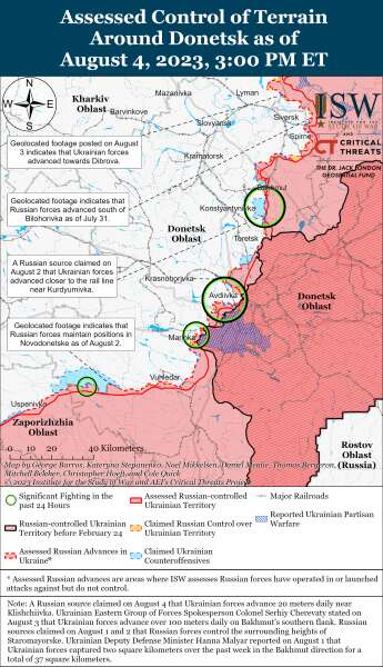 Российские войска продолжали безуспешно атаковать украинские позиции на линии Авдеевка-Донецк, но по состоянию на 4 августа не продвигались вперед. Украинский Генштаб сообщил, что ВСУ отразили вражеские атаки на север и юго-восток от Авдеевки, юго-восточнее Первомайского и вблизи Марьинки.