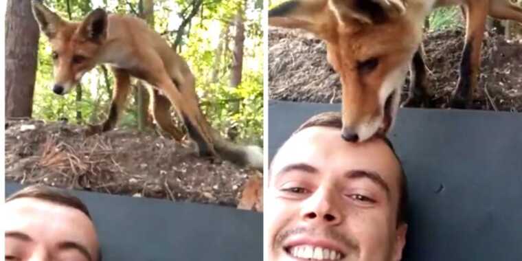 Сначала лиса осторожно подобралась к нему сзади, а потом принялась обнюхивать его голову.