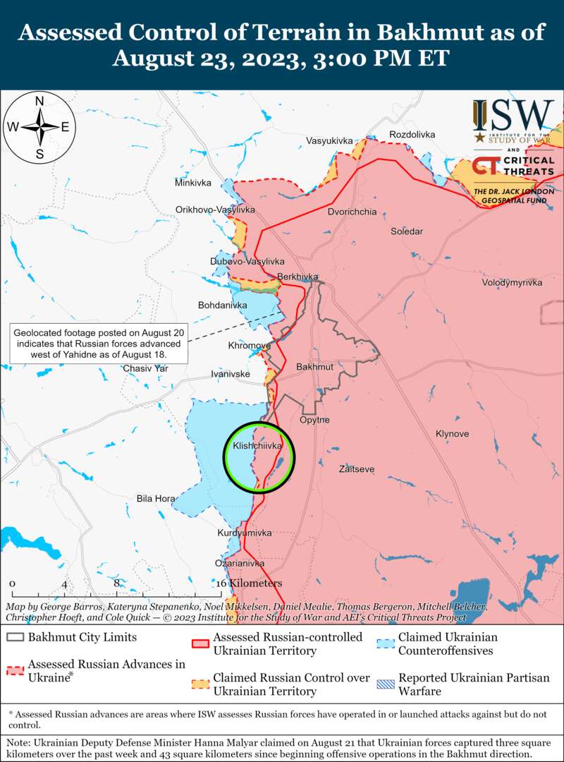23 августа российские войска продолжили наземные атаки в районе Бахмута, но не продвинулись. Украинский Генштаб сообщил, что российские войска вели неудачные наступательные действия вблизи Веселого (20 км северо-восточнее Бахмута) и Клещиевки.