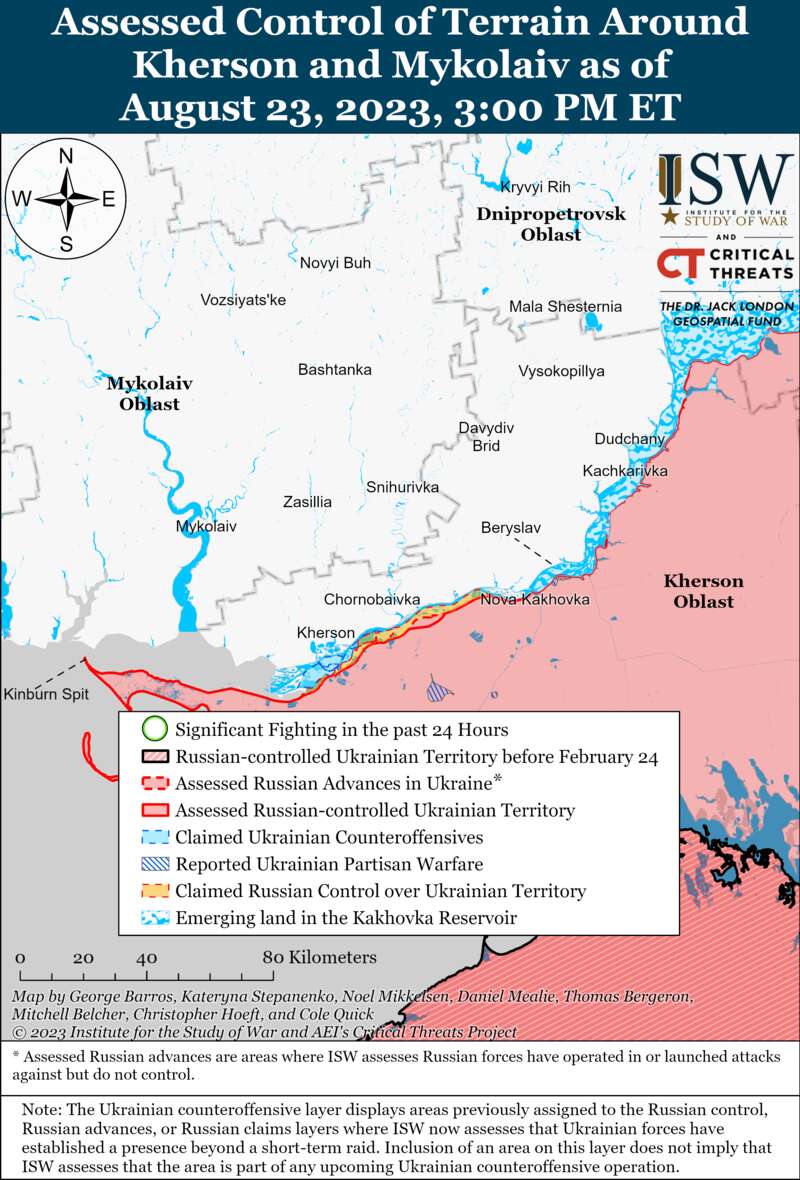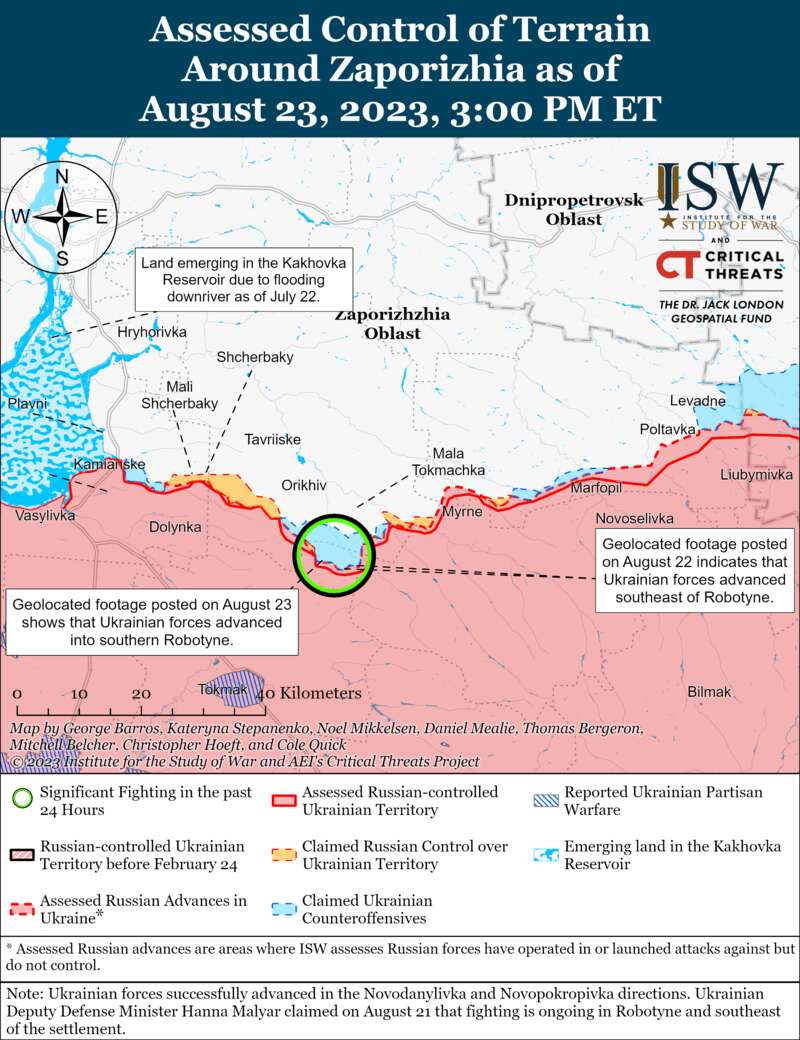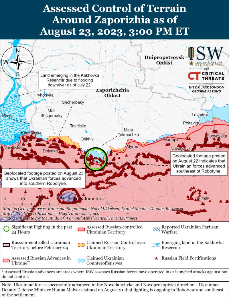 23 августа украинские войска продолжали наступательные операции и добились значительных тактических успехов в западной части Запорожской области. Опубликованные 22 августа геолокационные кадры показывают, что украинские войска продвигались к юго-востоку от Работино (10 км к югу от Орехова) и к северо-западу от Вербового (18 км к юго-востоку от Орехова).