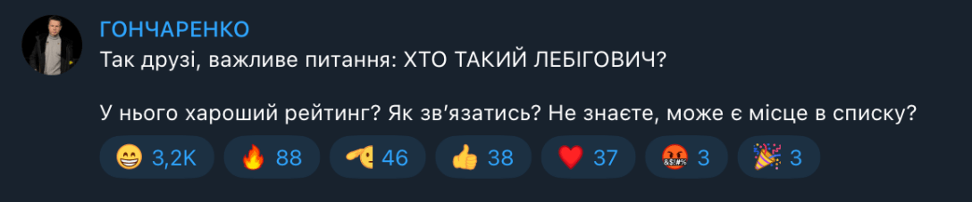 Алексей Гончаренко в своем телеграм-канале спрашивал, как связаться с Лебиговичем и какой у него рейтинг.
