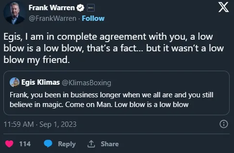 Об этом Климас написал в социальной сети X, ранее известной как Twitter, реагируя на сообщения промоутера Дюбуа Фрэнка Уоррена о том, что он подал апелляцию во Всемирную боксерскую ассоциацию . В частности, у британца не согласны с решением рефери Луисча Пабона признать нелегитимным удар Даниэля ниже пояса украинца.
