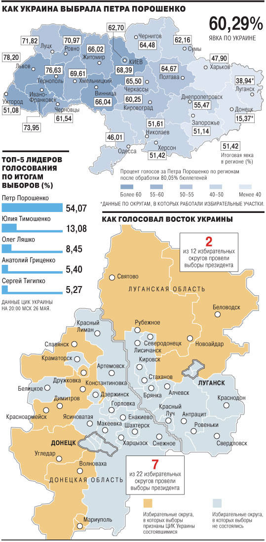 Наблюдатели от ОБСЕ признали демократичными президентские выборы на Украине, несмотря на сложную ситуацию в двух восточных областях страны. Ряд западных лидеров поздравил Петра Порошенко с "впечатляющим результатом" еще до объявления итогов голосования. Пресс-секретарь президента РФ Дмитрий Песков заявил "Ъ", что о возможной встрече Владимира Путина с новым украинским президентом "говорить пока рано".
