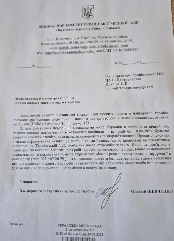 Исполнительный комитет Украинского городского совета направил обращение исполняющему обязанности директора Трипольской ТЭС Петру Кравцу, где просит объяснить причины появления посторонних запахов в воздухе. Кроме этого, если эти работы связаны с подготовкой к отопительному сезону, исполком просит заранее посылать предупреждения о выполнении такого вида работ, чтобы успеть предупредить об этом местных жителей.