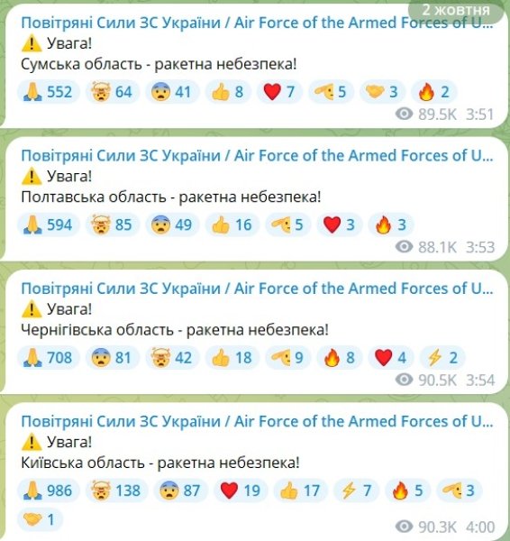 Под угрозой баллистики оказались Харьковщина, Днепропетровщина, Донецкая область, позже — Киевщина. Мониторинговые каналы сообщили о взрывах в Кривом Роге.