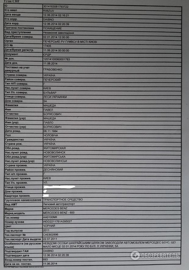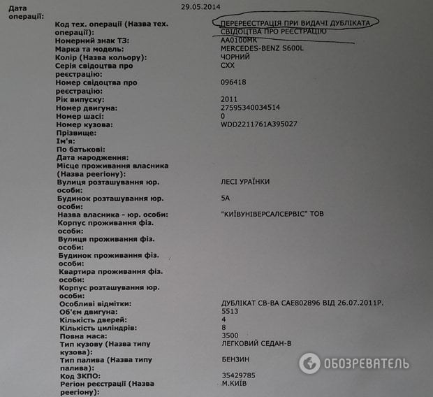 Известно, что автопарк Януковичей был зарегистрирован на ООО "Киевуниверсалсервис". Эта компания выполняла роль ДУСи для Межигорья: на ней был зарегистрирован весь обслуживающий персонал, фирма занималась закупками и даже засветилась в скандальной приватизации охотничьих угодий в Сухолучье. По данным "Обозревателя", 2 апреля 2014-го года в Печерское райуправление обратился замдиректора этого ООО с заявлением о незаконном завладении "неустановленными лицами" автомобилями, в том числе - бронированном Мersedes Benz S600 Limousine Lang черного цвета, объем двигателя —5513 куб.см, 2011 года выпуска, госномер АА 0100 МК, номер шасси WDD 2211761А395027.
