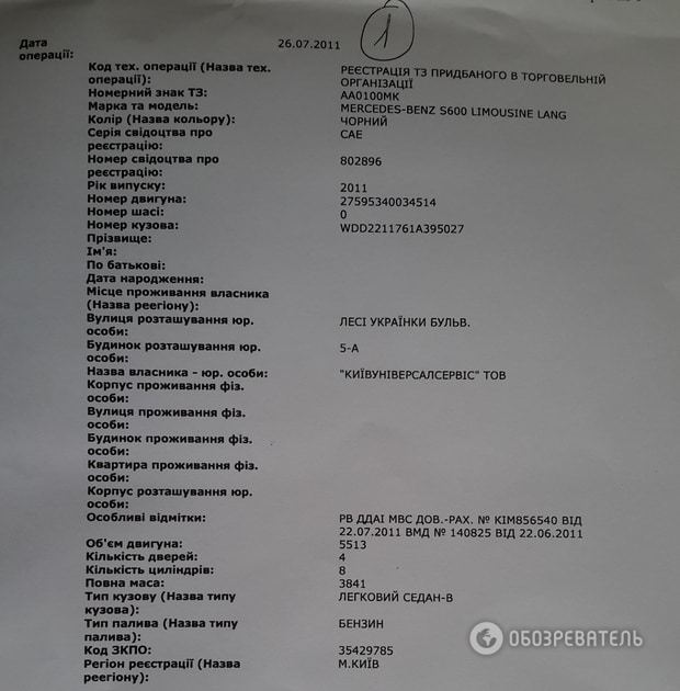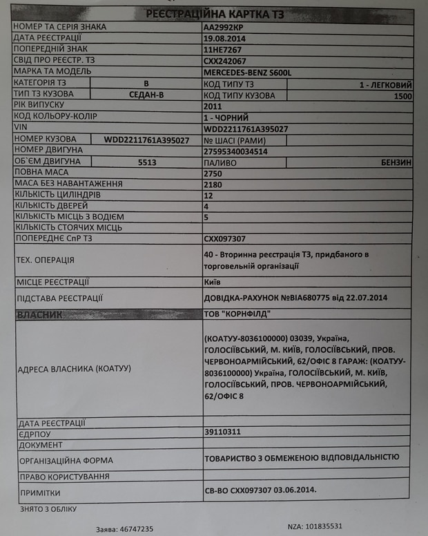 Автопарк Януковичей был зарегистрирован на ООО "Киевуниверсалсервис". Это "общество" являлось первым собственником злополучного Мersedes Benz S600 Limousine Lang.