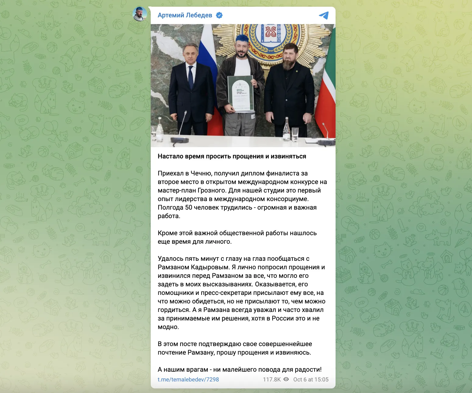 Российский дизайнер Артемий Лебедев, открытый украинофоб и путинист, приехал в Чечню "на поклон" к Рамзану Кадырову. Он лично встретился с главой республики и просил у него прощения "за все, что могло его задеть" в его предварительных высказываниях.