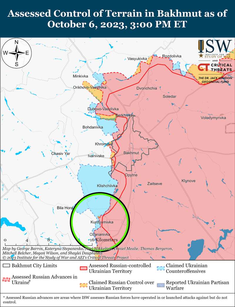 Украинские войска продолжали наступать на направлении Бахмута, и по сообщениям, 6 октября, они продвинулись к югу от самого Бахмута. По информации Украинского Генштаба, украинские войска преуспели в районе поселка Андреевка, расположенного в 8 километрах юго-западнее Бахмута.