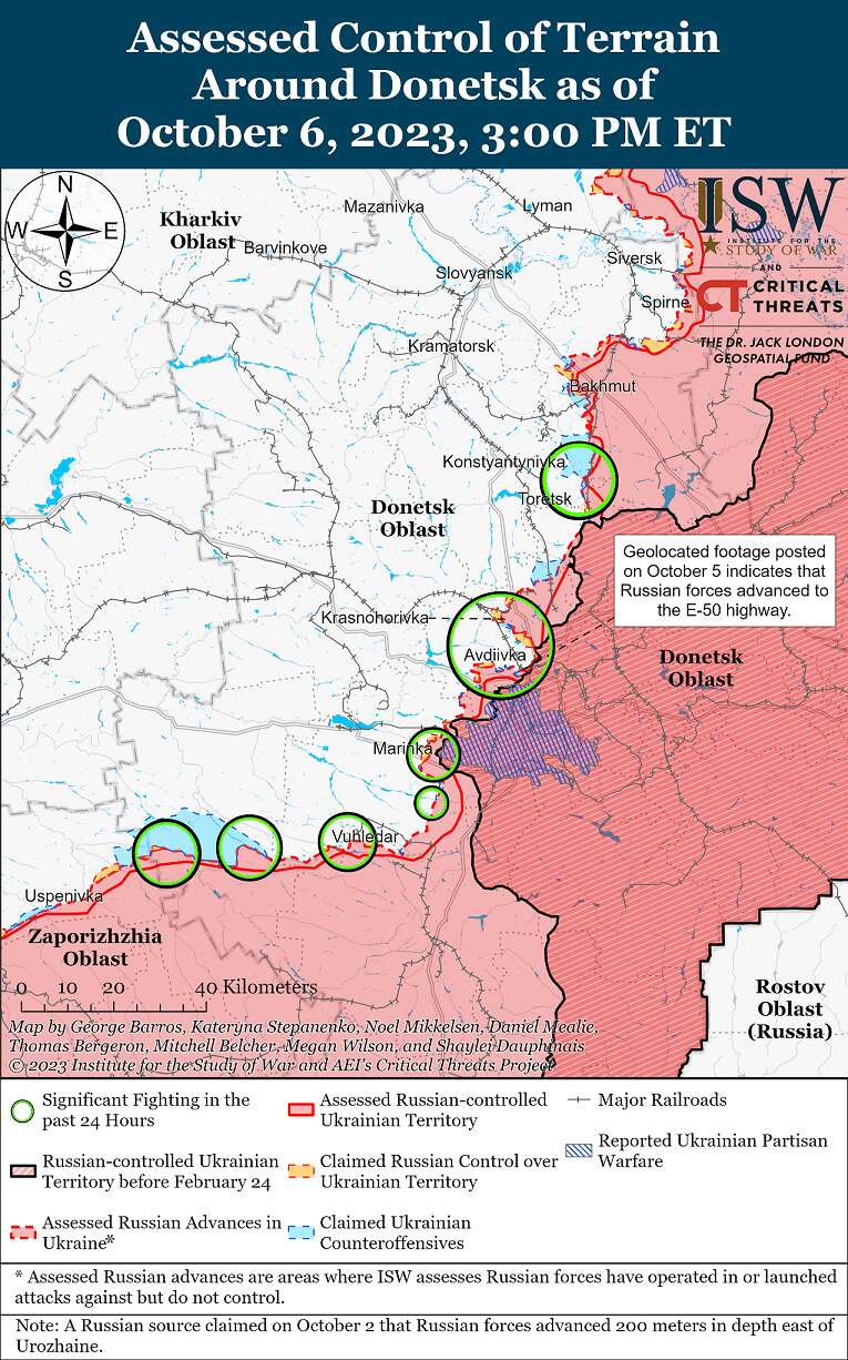 Также 6 октября российские войска продолжали наземные атаки вдоль линии от Авдеевки до Донецка, однако их прогресс был незначительным. Геолокационные данные, опубликованные 5 октября, указывают на расположение российских военных позиций к югу от Авдеевки у трассы E50, проходящей вдоль окрестностей Донецка.