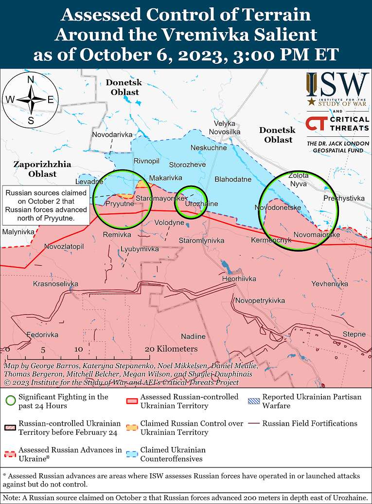 Шестого октября украинские войска продолжали ограниченные наступательные операции в районе границы Донецко-Запорожской области, однако не продвигали вперед. По информации российских источников, российские силы успешно отразили украинскую атаку возле населенного пункта Приютное (расположенного в 16 километрах юго-западнее Великой Новоселки).