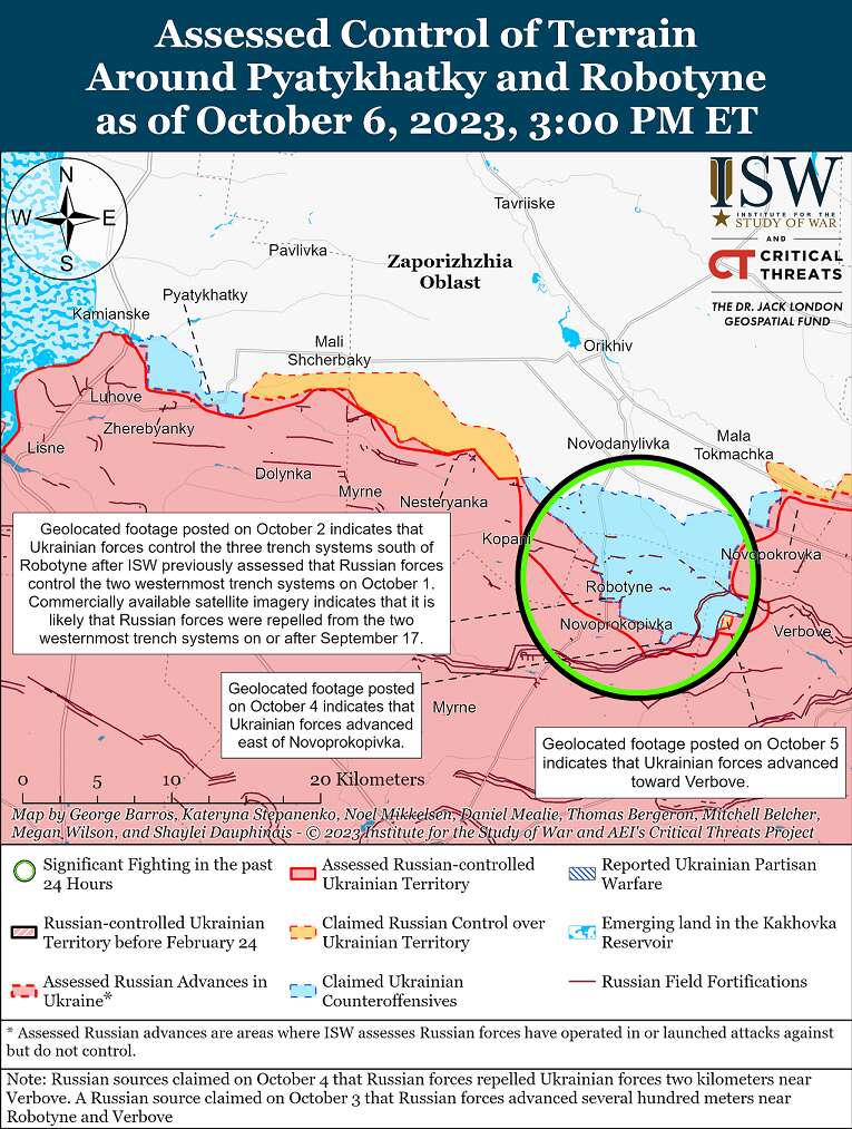 6 октября российские войска продолжали ограниченные и неуспешные контратаки на западе Запорожской области. Один из российских военных блогеров сообщил об атаке российских войск на украинские позиции в западном Работино.