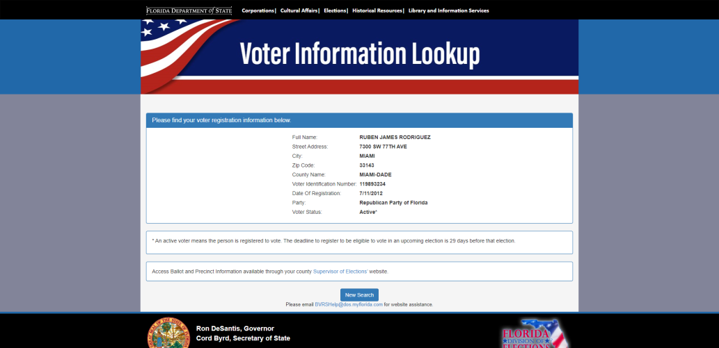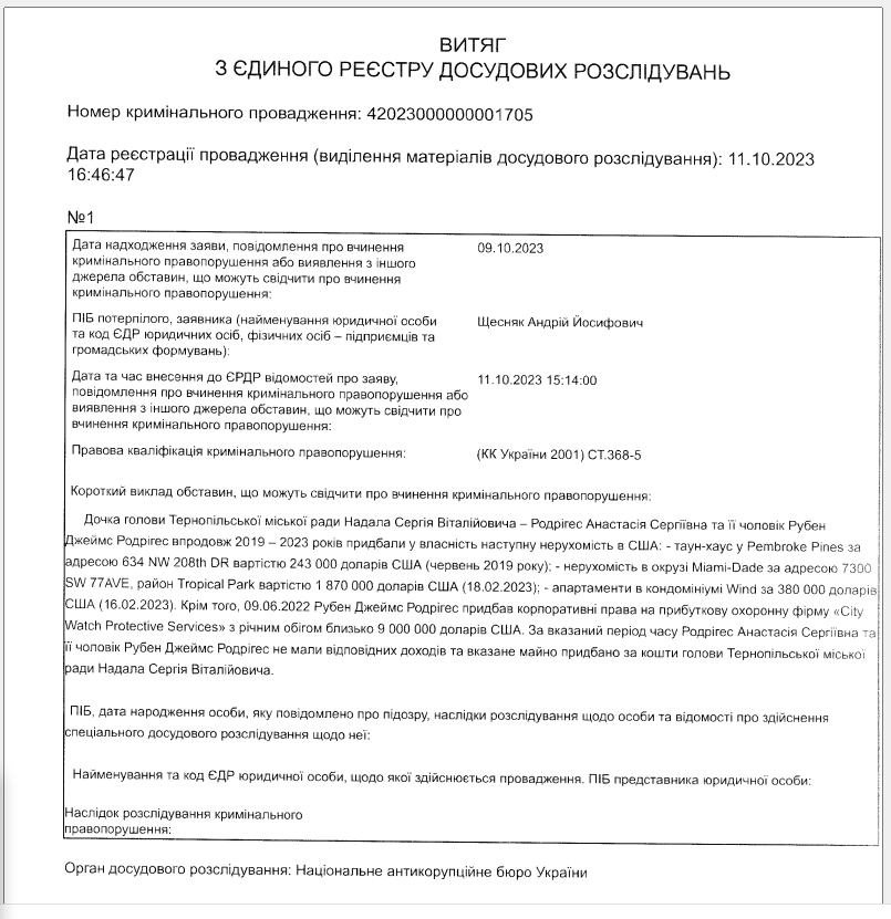 В конце 2022 г. я обратился в Государственный департамент штата Флорида для получения выписок из реестров и апостиля для этих документов. Документы были подготовлены и направлены в Украину летом этого года. Отдельно из реестра избирателей штата Флорида была получена выписка по регистрации по адресу особняка Анастасии Родригес ее мужа Рубена Джеймса Родригеса как избирателя Республиканской партии. Раньше у меня не было этих данных, поэтому они стали окончательными и безапелляционными для доказательства того, что дочь мэра Тернополя официально владеет имением за почти два миллиона долларов.