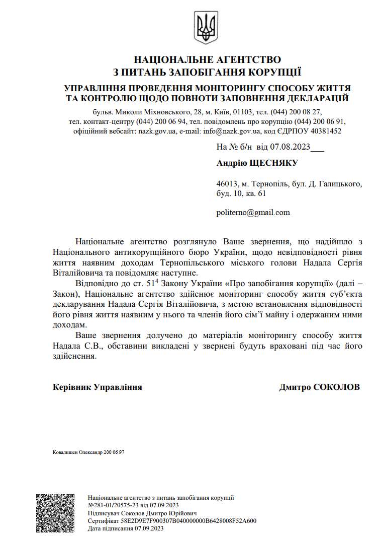 На обнародование новых данных мэр Тернополя решил не реагировать. Но на этот раз продолжение прошлогоднего расследования заметило Национальное агентство по предотвращению коррупции, которое начало проверку по «установлению соответствия уровня жизни имеющимся у Сергея Надала и членам его семьи имуществу и полученным доходам».