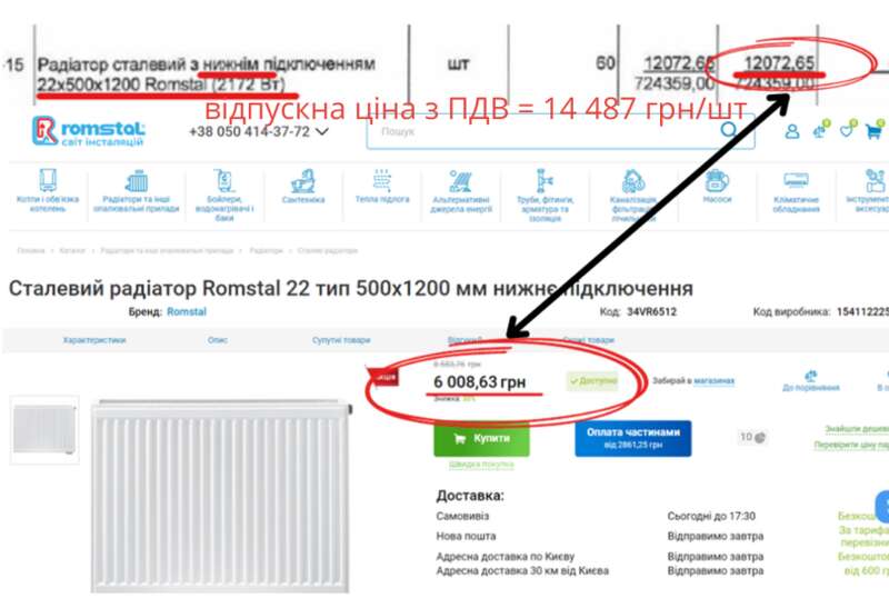 Стальные радиаторы с нижним подключением 22х500×1200 Romstal (2172 Вт) заказали по 14 912 грн. Магазины «Ромстал Украина» и «Тепло Опт» предлагают его по 6 008 грн.