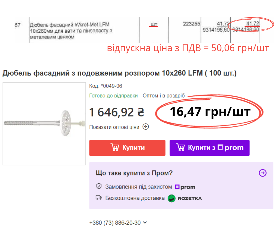 Дюбель фасадный Wkret-Met LFM 10х260 мм для ваты и пенопласта с металлическим гвоздем заказали по 50 грн/шт. Магазин «Розетка» предлагает их по 15,50 грн/шт., а «Мир Крепления» по 16,47 грн/шт., что в три раза дешевле.