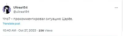 Пользователи интернета также пишут, что первым комментарием Царева по поводу этой ситуации была его коронная фраза "Что?". Она стала широко известна как мем после ситуации, когда Царев давал ответ журналисту на вопрос о Второй мировой войне, которая, по его мнению, началась в 1941 году.