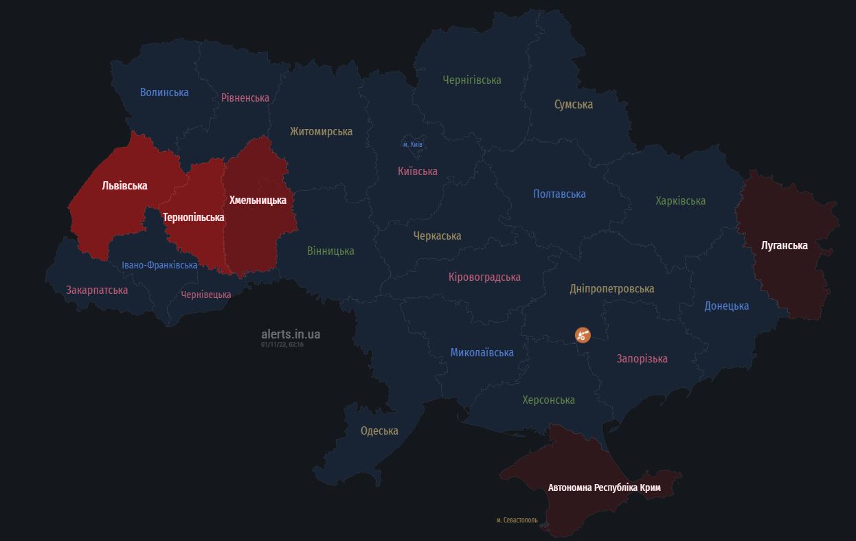 Уже в 00:09 об угрозе БПЛА предупредили жителей Тернопольской области, а в 02:59 тревогу объявили во Львовской области.