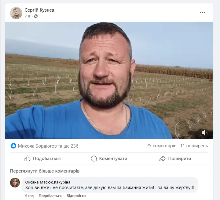 А еще, как говорят те, кто знал воина, у него было много мечтаний и планов, которые он собирался воплощать в жизнь после победы. В частности, мечтал заняться фермерством. И во время отпуска, завершившегося в начале ноября, начал осуществлять эту мечту: высадил 450 кустов жимолости на территории будущей плантации. Видео, которое счастливый воин записал прямо с поля, стало последним его сообщением на странице Facebook.