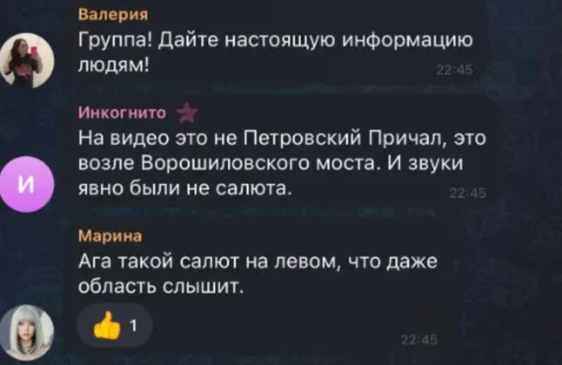 Однако россияне в комментариях сразу опровергли эту информацию. Они отметили, что взрывы раздавались совсем в другой стороне. А именно – возле Ворошиловского моста, и они совсем не походили на салют. Некоторые даже отметили, что этот "салют" слышали в пригороде и попросили руководство города предоставить достоверную информацию.